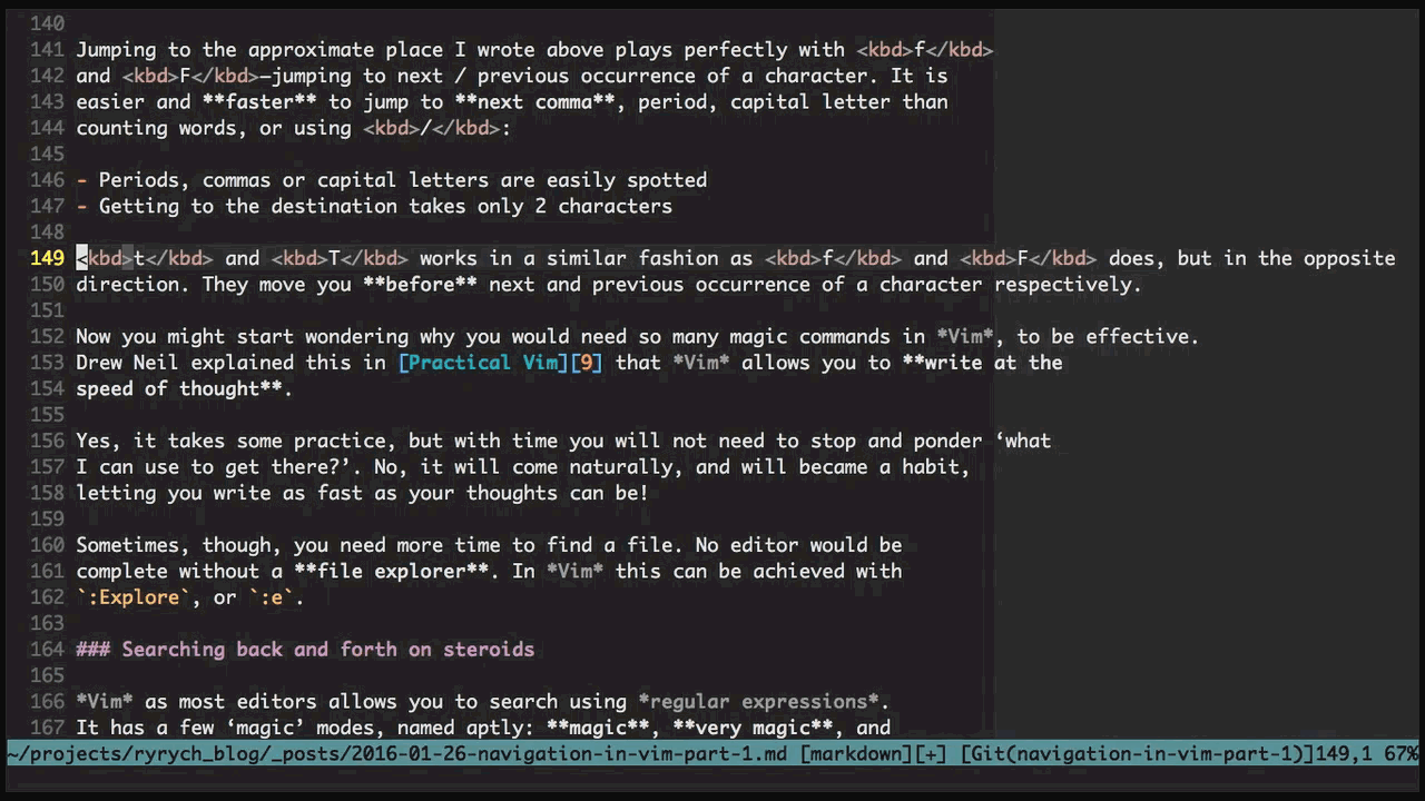 The article just scratches the surface, and I will write mostly about what I have found especially useful, as every Vim user has his own favourite tailor-made toolset or preferable workflow. Still, I hope that even more experienced users of Vim will find something useful in my article. I organized Vim navigation into the following groups: