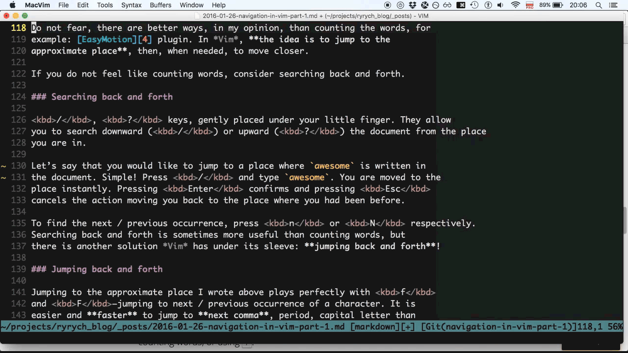 In the two-part article series I am going to describe different ways of navigation in Vim. The editor, unlike others, gives you the unique power of fine-grained control in many ways. This is also true for navigation.